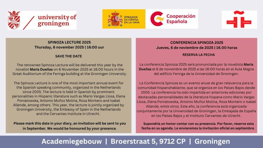 Donderdag 6 november vindt een nieuwe editie van de Spinoza Lezing plaats in de Universiteit Groningen. De Spinoza Lezing is een van de voornaamste culturele evenementes van het jaar voor Spaanstaligen in Nederland. Deze keer zal de Spaanse romanschrijfster María Dueñas de lezing voordragen.