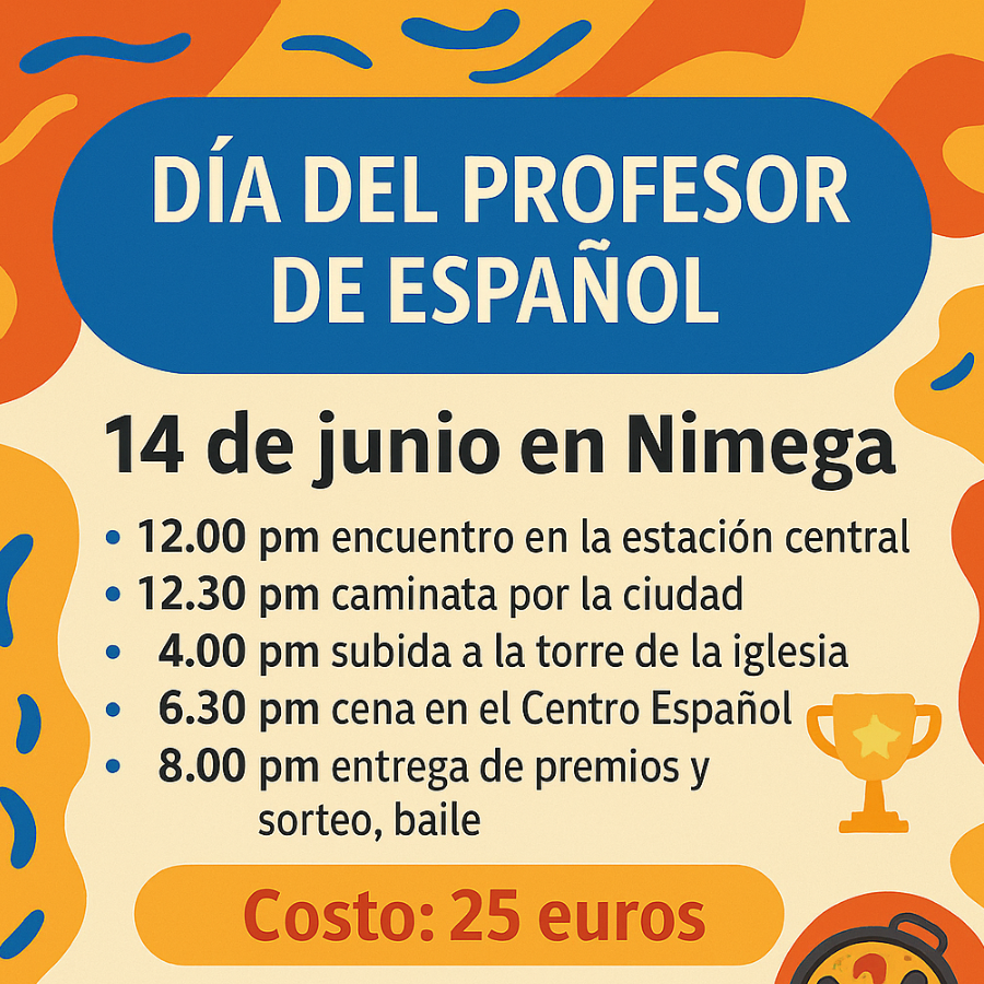 De sectie Spaans van Levende Talen viert elk jaar de Dag van de docent Spaans. Dit jaar gaat de dag door op zaterdag 14 juni in Nijmegen. Het is een dag waarop docenten samenkomen en deelnemen aan culturele, leuke en ontspannende activiteiten. Het programma omvat ook een diner en een dansavond.